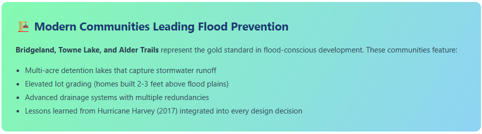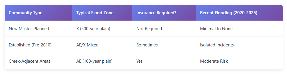 No. Flood risk varies dramatically by neighborhood. Most new developments (post-2010) feature advanced drainage and elevated construction, with minimal to no flooding even during severe weather. Older areas near Cypress Creek may experience occasional street flooding, but modern communities like Bridgeland have remained dry through major storms.